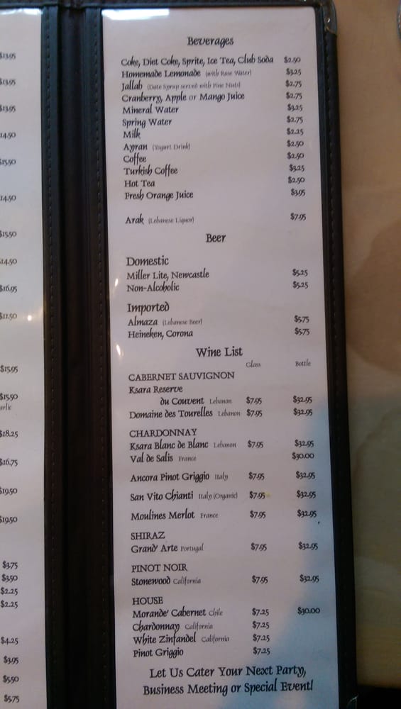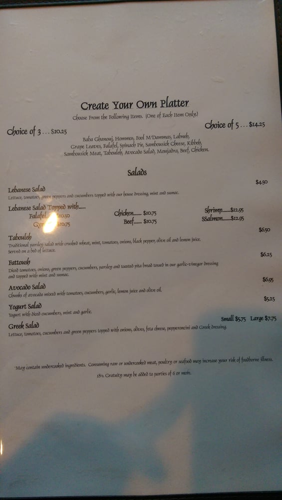 Choose any : Baba Ghanouj, Hummus, Fool Mdammas, Labneh, Grape Leaves, Falafel, Spinach Pie, Cheese Sambousick, Kibbeh, Meat Sambousick, Tabouleh, Avocado Salad, Moujadra, Beef, Chicken.