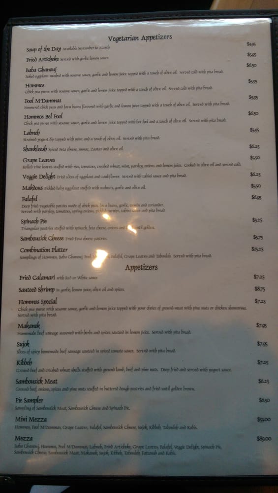 Baba ghanouj, hummus, fool mdammas, labneh, fried artichoke, grape leaves, falafel, veggie delight, spinach pie, sambousick cheese, sambousick meat, makanek, sujok, kibbeh, tabouleh, fattoush, and kabis.